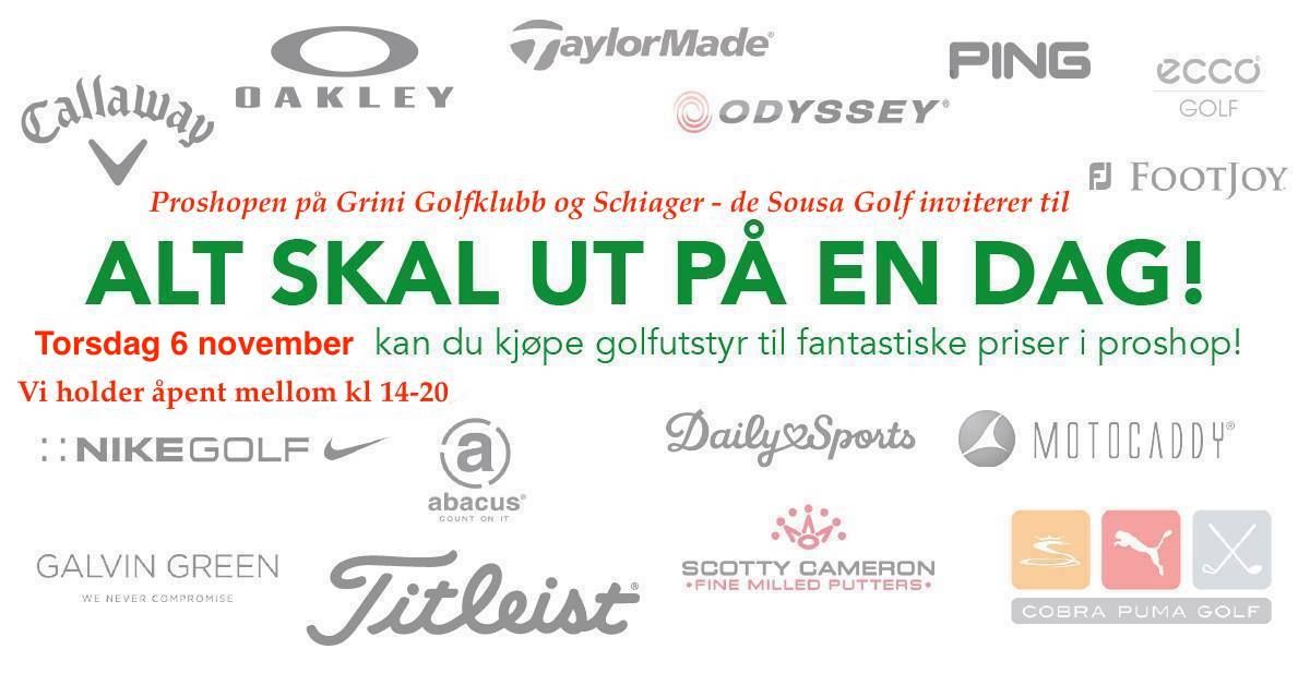 Proshopen på Grini Golfklubb og Schiager - de Sousa Golf inviterer til prisfest - "Alt skal ut på en dag" torsdag 6 november.